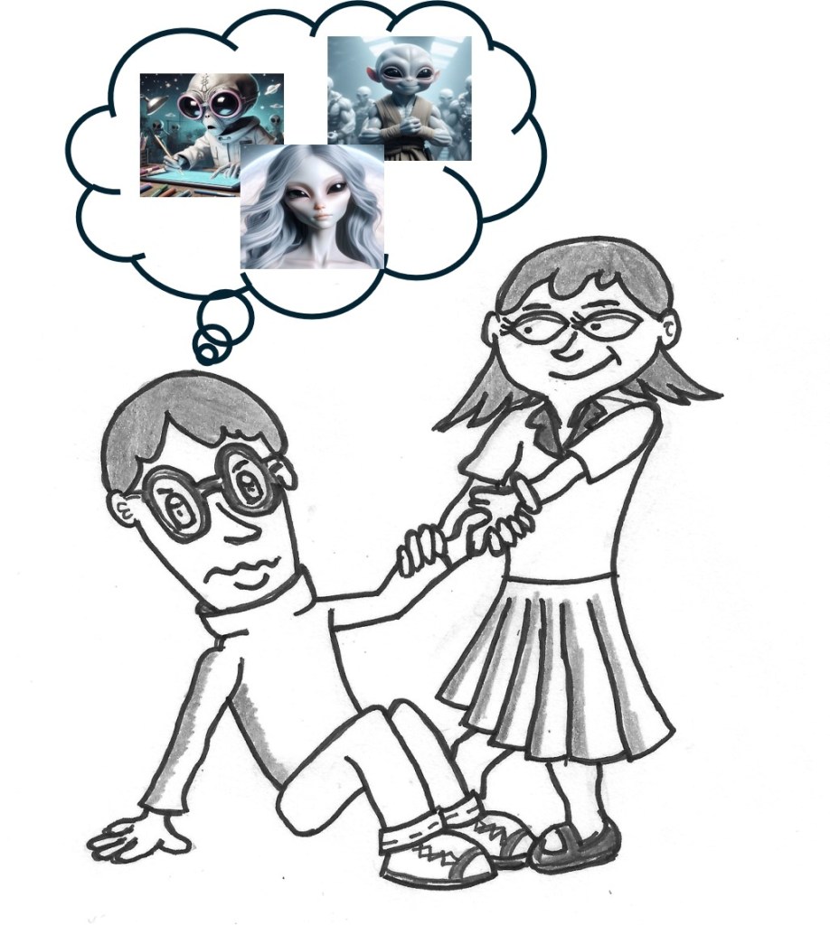 Me volví y vi a un extraterrestre alto como un jugador de baloncesto, de color verde grisáceo y con unos brazos largos y delgados. La cabeza temía forma ovalada, y la boca era grande comparada con los hoyuelos pequeños de su nariz, en lo que más me fijé fue en sus ojos grandes y redondos que brillaban como dos faros. Pensaréis que estaría yo muerto de miedo, pero realmente no lo estaba, sería debido a la expresión serena que mostraba su rostro o quizás porque estaría manipulando mi mente para tranquilizarme.